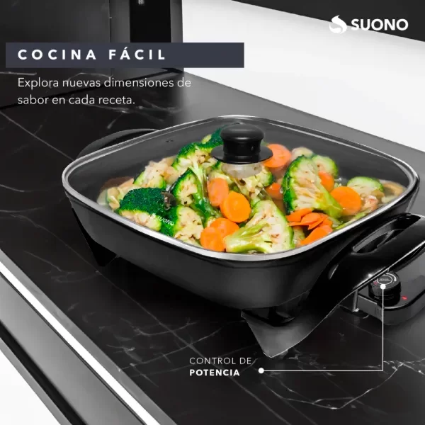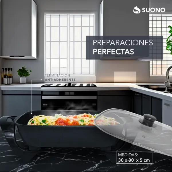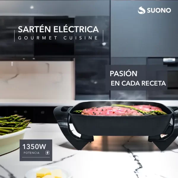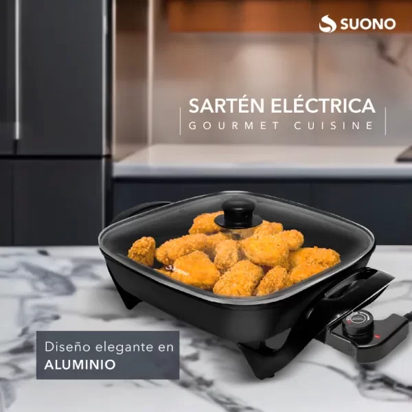 Sartén Eléctrico Antiadherente Suono 1350W con Tapa de Vidrio – Cocina Fácil y Sin Complicaciones El Sartén Eléctrico Antiadherente Suono es la opción perfecta para cocinar de manera práctica y rápida. Con 1350W de potencia, superficie antiadherente de alta calidad y tapa de vidrio templado, podés preparar una gran variedad de platillos sin que los alimentos se peguen y con un control óptimo de la cocción.